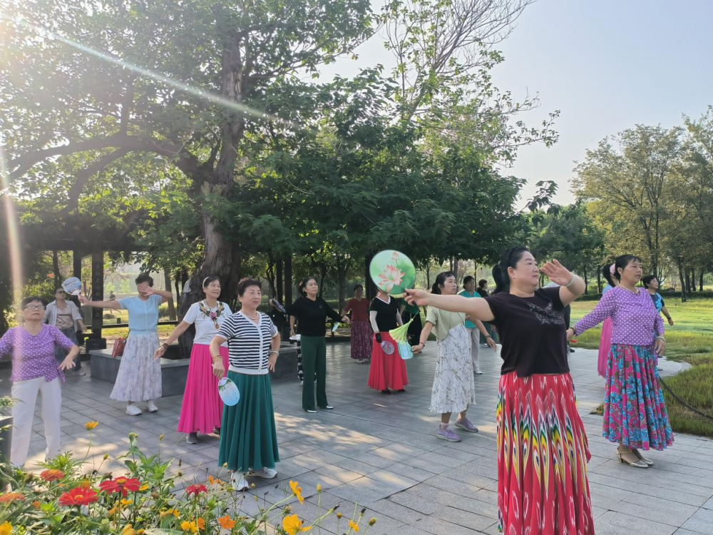 2025年9月1日,烟厂后街社区新时代文明实践站借助友邻单位商都遗址公园开展了“共舞幸福曲˙银铃展风采”广场舞教学活动。