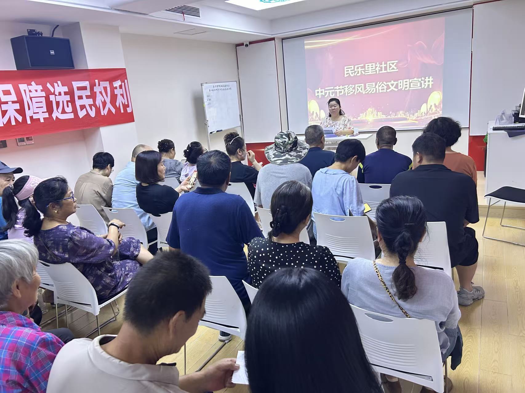 9月4日,陇海马路街道民乐里社区新时代文明实践站率先开展中元节移风易俗主题宣讲活动,近50名居民积极参与。活动现场,社区工作人员向居民详细讲解了中元节的由来、传统习俗及历史发展脉络,同时宣读《文明祭祀倡议书》,倡导居民摒弃焚香烧纸等旧习,采用鲜花祭祀、网上祭祀等绿色环保方式祭奠逝者,牢固树立文明祭祀理念。