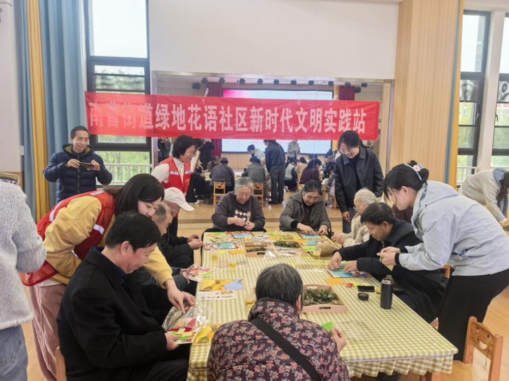 “重阳节主题手工画” 制作中,志愿者耐心讲解重阳节的由来和茱萸文化内涵,手把手教小朋友将手工材料搭配在一起,将对老人的祝福融入画作,亲手赠予老人,传递童真关怀。随后的“制作茱萸香囊”环节吸引众多居民参与,大家围坐在一起,填充茱萸、艾草等材料,在互相协助中制作出一个个精致香囊,现场满是艾草清香与欢声笑语。